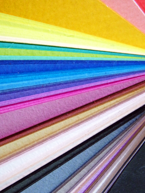 カッター片手に机の上に散らばった色紙を探したり