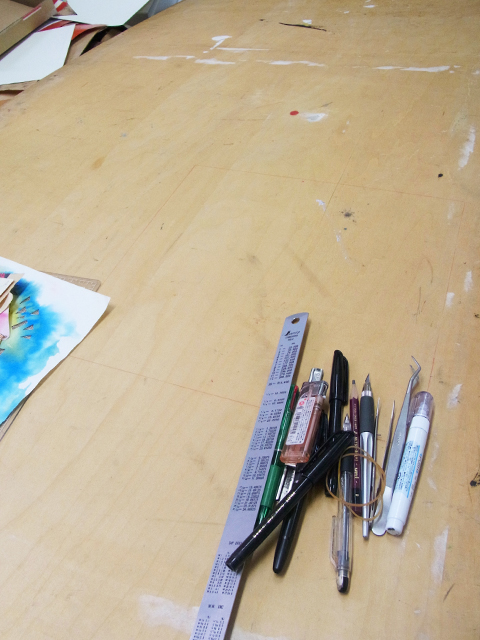 畳ほどのベニヤの天板をテーブルに置いての作業。