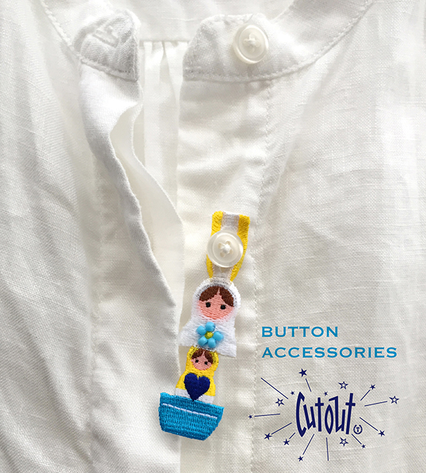 ピンでは無く、刺繍のアクセサリーにボタンホールが開いていて、シャツ、ブラウス等のボタンに引っ掛けるワンポイント・アクセサリーです。